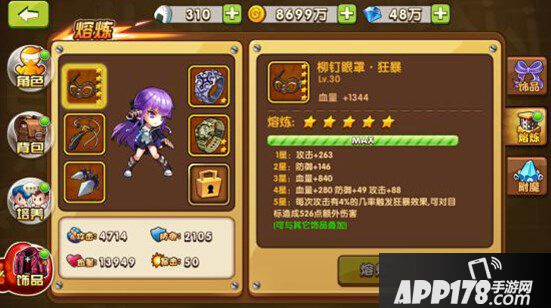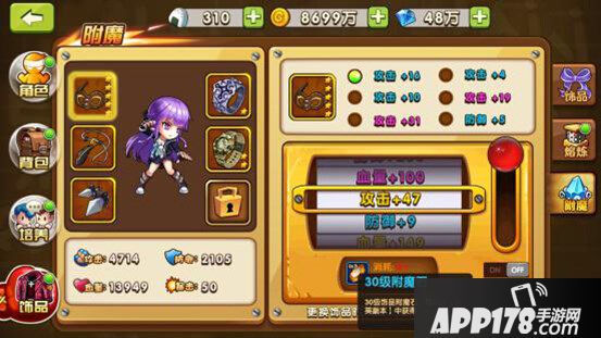 为了加深游戏体验,提高游戏深度,饰品就像装备的进阶,给追求极致的玩家提供了机会。与装备不同,饰品可通过关卡掉落,或“小卖部”里的扭蛋开出,根据主角携带部位分别有眼罩、项链、耳钉、戒指、手腕和背包等6种,它们除了增加一定量的攻击、防御、血量等属性,还可以通过熔炼、附魔来继续追加额外属性。