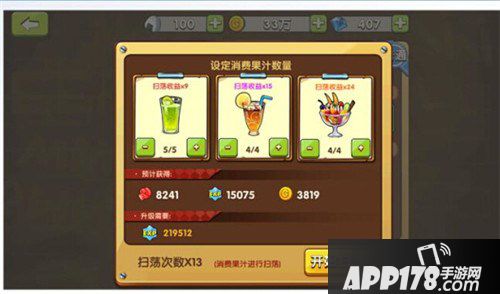 副本扫荡功能会在角色等级到达20级时自动开放,同时开放的还有饮料系统。副本扫荡可以免除操作过程直接获得副本掉落的物品以及经验奖励。但是副本扫荡需要消耗一定的饮料,饮料可以在果汁店榨汁或使用钻石购买水果再行榨汁获得。要知道,使用饮料扫荡可以获得手动挑战普通副本9~24倍的经验以及铜钱呦~