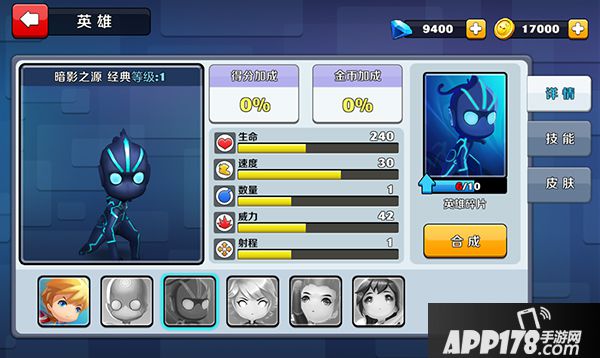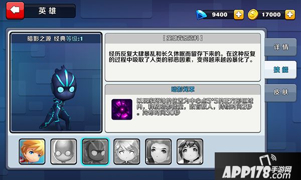 吸收人类邪恶能力异常凶残的暗影之源,他就是躲在黑暗中的杀手,其英雄技能“暗影笼罩”,英雄所站位置为中心点5*5的正方形区域内,释放暗影能量,致盲敌人,持续2秒,冷却时间30秒。