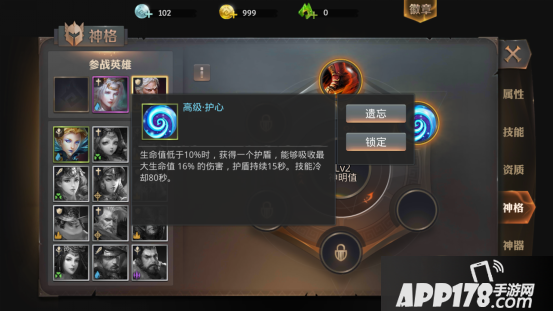 像这种近战肉盾的英雄,要搭配护心以及钢躯神格,这样可以保证自己的存活。自愈就不要了,受伤太多,加上自愈没什么用。当然还可以有类似封魔等提升自身抗性的神格,这都是相当不错的。