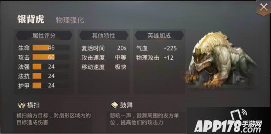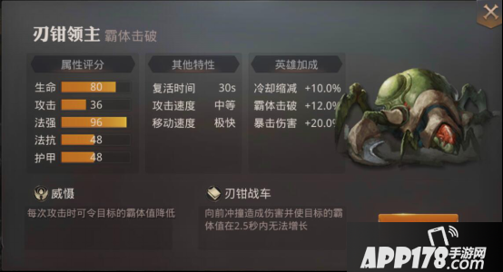 正如他的外号一样,法师克星,加成给玩家加24点魔抗,技能一普攻减对方法强,而且他的攻速移速是极快,所以不用担心随从打不到对方,技能二扑向对方对敌方造成他法强的伤害,这个技能也很强,特别是后期,这比伤害还是很高的,推荐带一个这只,针对敌方法师