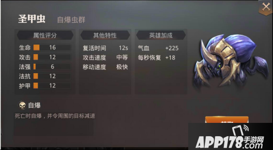 不错的一个随从,各种方面来说,技能是减速,加成=225生命,适合那种近战没有减速和控的英雄带,因为随从是跟着玩家行动的,一个近战英雄进团的话如果对面想控住他再逃跑的话就很容易打死圣甲虫触发减速,而且加最大生命也会让近战更能抗点