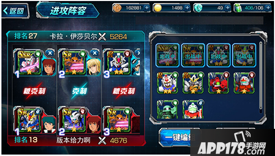 当您进攻时,可以预览对手的战力和阵容。在《SD敢达强袭战线》中机体之间存在属性相克的关系。拳头克制剪刀、剪刀克制布、布克制拳头。选择合适的机体和机师进行战斗,才能获得最后的胜利。