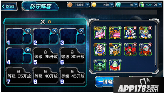 敢达擂台中分为防守阵容和进攻阵容。随着指挥官等级的提升,可编组放置的机体数量越多。设置编组后,记得要点击“储存编组”的按钮进行保存哦~