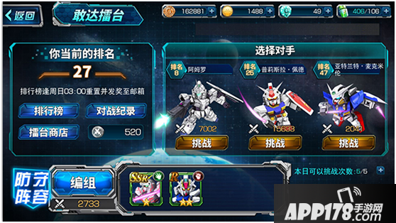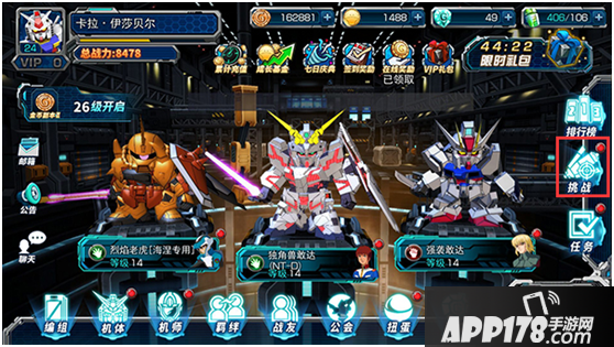 那么作为游戏中的PVP系统,今天我们就来为大家介绍下“敢达擂台”系统。当各位指挥官达到10级后,即可开启敢达擂台系统。我们可通过主界面的挑战按钮进入。