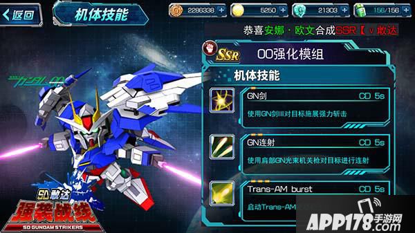 《SD敢达强袭战线》中,00强化模组与飞翼零式敢达并列,位于SSR机体的顶端。与飞翼零式的暴力大范围AOE轰炸不同,00强化模组拥有更快的移动速度和攻击速度。