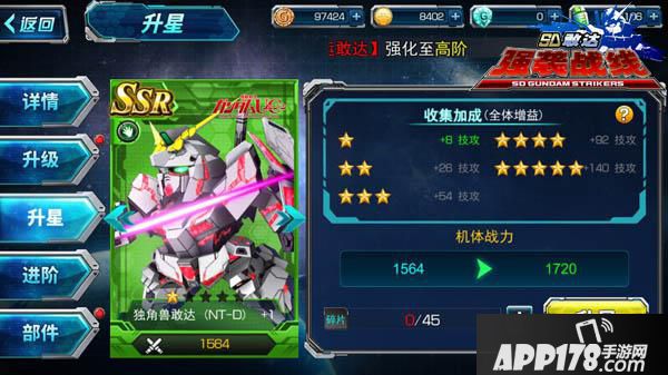 升星可以大幅度提升机体的战力。玩家收集某一已拥有机体的机体碎片达到一定数量,便可以对机体进行升星,总共可以升到五星,随着星级提高,到达下一星级所需碎片数量也会提高。机体碎片可以通过指定关卡掉落、签到和扭蛋机抽取来获得。尽情的去战斗,希望各指挥官早日获得喜欢的“五星上将”机体!