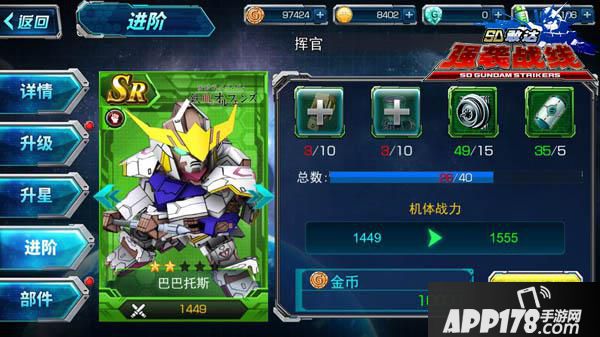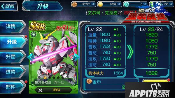 《SD敢达强袭战线》的强化系统主要是针对机体的强化。机体的可以消耗金币升级到与指挥官等级相同的级别,每升高一级,机体的六维数据就会有所提高,这是强化系统里面最基础的强化,要想尽快提高部队的战力,那就去多多战斗,完成日常任务,尽快获得经验提高指挥官等级。