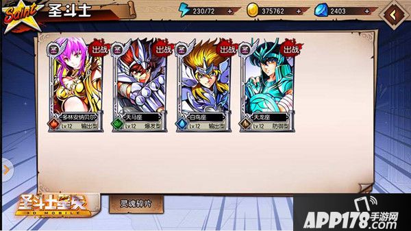 在《圣斗士星矢3D》的圣斗士界面中,我们可以了解到当前拥有的圣斗士,以及他们当前的等级、属性、是否出战等各种角色状态。下方的灵魂碎片,则可以让我们知道拥有了哪些圣斗士的灵魂碎片,当某一个圣斗士的灵魂碎片达到要求后,就可以直接召唤圣斗士,令其加入队伍,一同守护雅典娜!