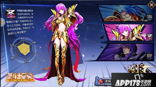 在《圣斗士星矢3D》的创建角色界面,我们需要率先从“海”、“圣”、“冥”,三个角色中选择一个做为主角色,系统通过六芒星,简单明了的告诉我们,每个角色的爆发、恢复、突进、控制、输出、生存能力的各项指标。我们可以通过六芒星来确定我们需要一个生存能力强大、又肉又能打的圣,还是输出爆表、进可攻退可守的冥。每个帐号可以创建5个角色,可以让每位玩家充分的体验不同角色的战斗乐趣。