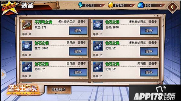 在《圣斗士星矢3D》的装备界面中,我们可以查看到当前所有装备,并且可以知道哪件装备已经被角色佩戴在身上,下方的装备碎片,可以让我们查询到当前获得了哪些装备碎片,当同一种装备碎片达到指定要求后,就可以直接换取成品装备。