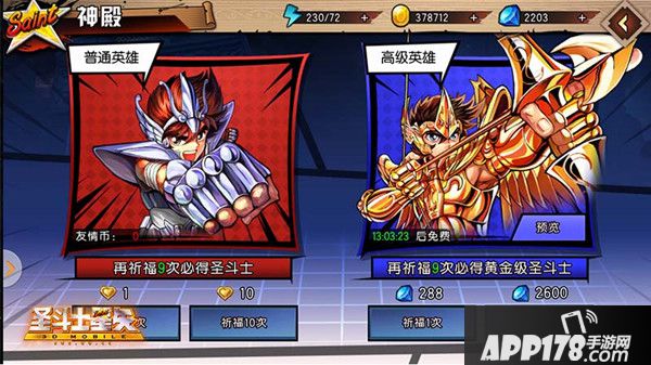在《圣斗士星矢3D》的祈福神殿中,玩家可以分别使用友情币或者星币用来抽取圣斗士。每当你累计使用9次友情币抽取圣斗士之后,第十次必得圣斗士哦!贴心的系统,每天都会赠送给每位玩家一次免费使用星币抽取圣斗士的机会,同样,每当你累计使用9次星币抽取圣斗士之后,第十次不仅会得到圣斗士,而且还一定是珍贵的黄金圣斗。!使用星币直接抽取10次,更划算哦!