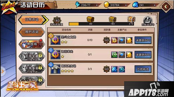 在竞技场中,你可以通过挑战其他玩家,来提升自己的竞技场名次,每天系统都会赠送10次挑战机会,所以一定要做好十足的准备才可以去挑战别人哦!在挑战过程中,不仅可以手动操作,更可以解放双手,使用自动战斗!看着自己的圣斗士施放一个个绚丽的技能,真是让人热血沸腾。当你觉得今天已经无法再继续挑战的时候,可以选择“每日战利”,获取竞技场币。用竞技场币可以兑换各类圣斗士灵魂碎片,圣斗士突破石和装备宝箱。在装备宝箱中有几率获得整套装备。不仅如此,每当你达到系统指定的竞技场排名之后,将会获得神圣的黄金圣衣碎片。集齐碎片后,更可兑换黄金圣衣!
