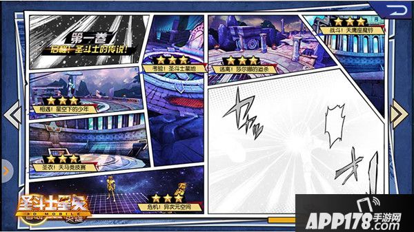 游戏为各位玩家准备了漫画式的副本界面,在这里,可以重温一次圣斗士的传奇。副本分为普通模式和英雄模式两种副本体验。在普通副本中,玩家三星通关副本,将会开启扫荡模式,为各位玩家节省时间。普通模式的副本准备界面,你可以清晰的了解本关副本的怪物阵容,通关奖励。在准备界面的右侧,你可以了解到本关达成三星通关的所需条件、以及系统的推荐战斗力,及时调整阵容,轻松通过副本。