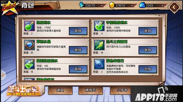 背包界面对玩家的各项道具进行了详细的分类。方便各位玩家快速寻找所需要的游戏道具。在背包界面,还可以看到当前的体力上限、体力剩余、游戏币数量、星钻数量。