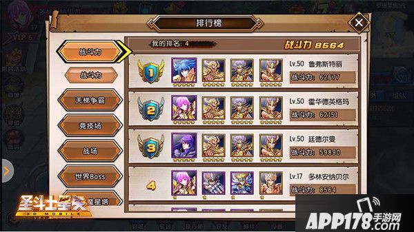 在《圣斗士星矢3D》的排行榜中,玩家可以直观的看到战斗力排行榜、天梯排行榜、竞技场排行榜等各类榜单。知己知彼方能更快提高实力。