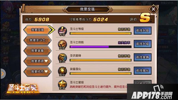 你在打副本的时候是否遇到过BOSS太强大,怎么打他都不掉血?你在竞技场中是否感受过明明是自己的操作更胜一筹,却因为战斗力略低,导致战斗失败?你在为圣斗士强化装备的时候,是否感觉到游戏币不够用?这些,都不是问题!《圣斗士星矢3D》贴心的为各位玩家准备“变强攻略”。点击主界面中的“变强”,即可进入,在“我要变强”的界面中,系统会为你精心指导,告诉你当前还有哪些方法可以提升实力,你还可以在这里知道如何获得想要的圣斗士、想要的装备。在这里,学会提升自己的实力,在接下来的游戏中,你将会获得更好的游戏体验,更多的游戏乐趣。
