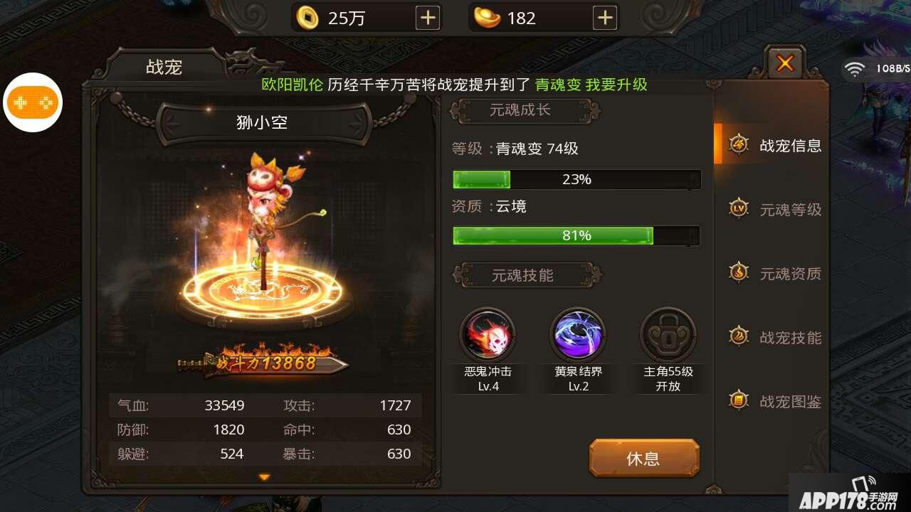 8、战宠,召唤战宠可以跟随英雄去战斗哦,还可以使用战宠的技能。战宠的技能和属性都是可以给英雄增加战力的。
