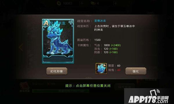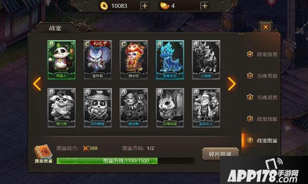 战宠图鉴,就是一个已经获得和未获得宠物的一个册子,但别小看这个册子,要想获得大幅战力提升,还得依仗于它呢!册子上的每个已经获得的宠物,是可以进行强化的,从C到S,需要的碎片也会递增,所以各位,还是抱着敬仰之心,努力收集碎片吧!