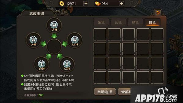 合成也类似装备合成一样!不过玉印是5合一!点击淬洗就是合成了!5白合成一绿!5绿合成一蓝以次类推到最好的橙色!