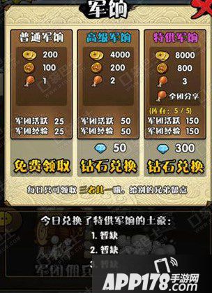 高级军饷需要花费50钻石兑换可以获得4000*金币、2*鸡腿和200*军团奖牌