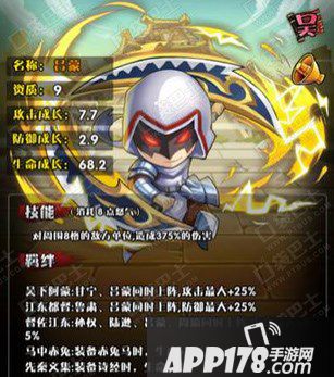 三国笑传吕蒙详解,吕蒙羁绊天赋解析。吕蒙,游戏中众多武将之一,玩友们对于吕蒙属性、技能、天赋羁绊一定很好奇吧,下面就随小编来看看三国笑传吕蒙武将怎么样吧。