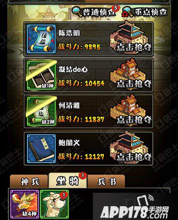 所谓的宝物合成就是需要玩家们利用宝物碎片来合成高等级的宝物,所以我们合成界面就会有“抢夺碎片”以及“购买碎片”,而在界面下方就是我们目前宝物的种类,有兵器坐骑以及兵书等,这些都是可以装备在武将的身上来增加武将的战斗力。