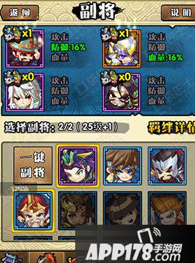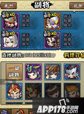 玩家们手中的武将卡牌都是有可能和上阵的武将有着潜在的羁绊关系哦,当头像亮起的时候就可以选择啦,当然,要是玩家们不明白各个武将之间的羁绊还可以“一键武将”哦,系统会自动的帮你匹配你的副将,副将的个数随着等级的提升而增加。