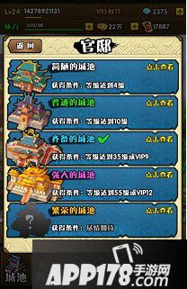 点击 “官邸”,可进入官邸界面。在这个界面可以看到不同等级城池的获得条件。不同等级的城池不仅外观不同,在摇钱树等功能上也会有额外加成。