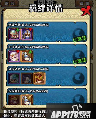 当同时拥有指定武将时,将触发羁绊效果,额外增加武将的攻击、防御、血量。