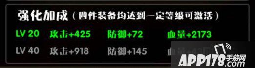 当4件装备均强化到10级、20级时将分别增加强化加成属性;同时装备4件名称一样的装备还将触发套装属性加成。