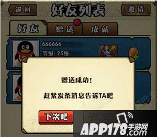 武将图标边上还有一鸡腿按钮,点击鸡腿,就可以赠送该好友游戏体力了,每次赠送体力为6点,赠送完后你还可以选择告不告诉他。