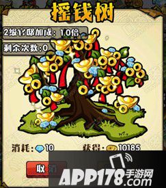摇钱树,在游戏界面上方,体力按钮的右边有个金币按钮,点击后出现摇钱树,点击摇一摇,消耗钻石以摇出金币。根据VIP等级来划分每天摇钱次数。