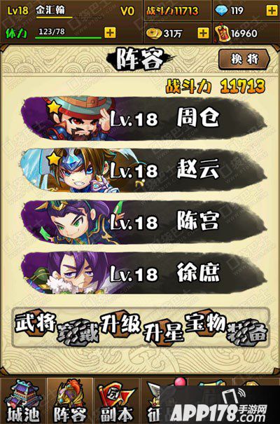 拥有了足够的战力,不错的武将,没有合理的阵容搭配也是不行的,下面是一为玩家18级时候的阵容搭配。