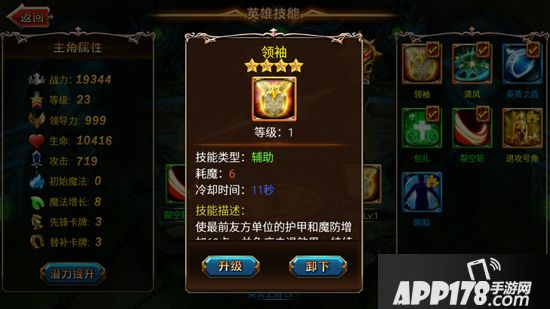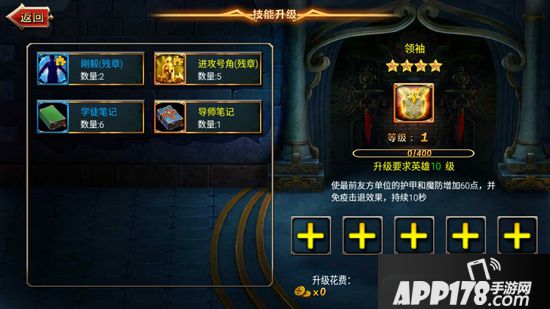 在升级中,玩家一次可以添加五样提升技能经验的素材,在消耗一定的金币之后,技能等级就可以提升,获得更加强大的技能效果啦。在选择提升素材的时候,玩家可以用碎片和学徒笔记、导师笔记几样道具来提升。导师笔记等物品可以通过商店购买或是活动中获得,而技能碎片可以在开宝箱和掠夺中收集到。