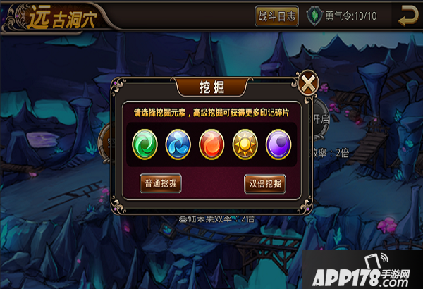 在远古洞穴有两种途径来获得所需印记,可以选择攻击目标,掠夺印记,也可以自己派遣英雄挖掘所需要种类的印记,花费一定的钻石还可以获得双倍数量的元素印记。需要注意的是掠夺他人的元素印记需要消耗掠夺令,效果和精力类似。