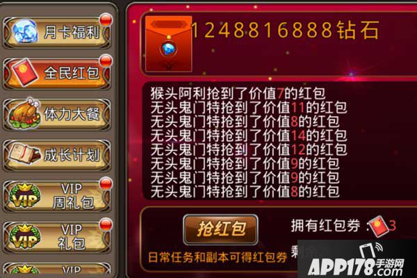 在活动界面,可以抢红包哦,红包里可是有很多钻石的哦,每天都可以领10次,在日常任务里和副本里就可以得呢。