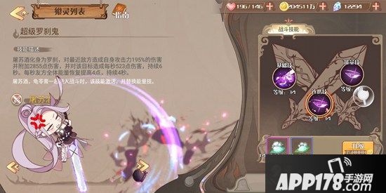 战斗技能御魔刀属于群体攻击,能给敌方群体造成自身攻击力70%的伤害,同时使敌方全体增益效果清空。能量技能罗刹鬼是对最近的地方造成自身攻击力160%的伤害,并持续为该目标造成伤害。当龟苓膏与屠苏酒一同入战斗,将释放出罗刹鬼的升级版连携技——超级罗刹鬼。也就是说,屠苏酒的攻击力升级得越高,她的战斗能力更显著。