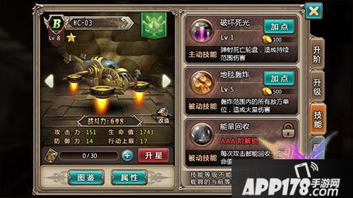 HC-03共有三个技能,初始技能破坏死光可以弹射死亡轮盘,造成持续范围伤害。升到B阶将解锁地毯轰炸,可以轰炸范 围内所有地方单位,造成大量伤害。升至AAA阶将解锁能量回收,每次攻击都能回收一定生命值。