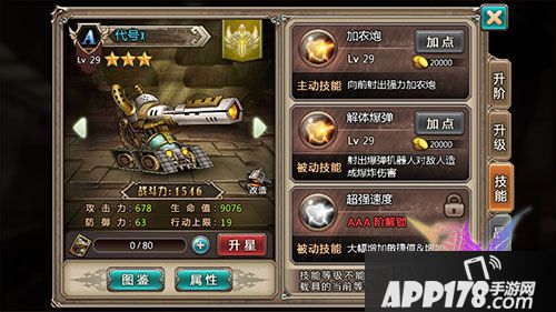 代号X共有三个技能,初始技能加农炮可以向前射出强力加农炮,对全体敌人造成持续伤害。升到B阶将解锁解体爆弹技能,可以射出爆弹机器人对敌人造成爆炸伤害。升至AAA阶将解锁超强速度技能,可以大幅增加敏捷值。