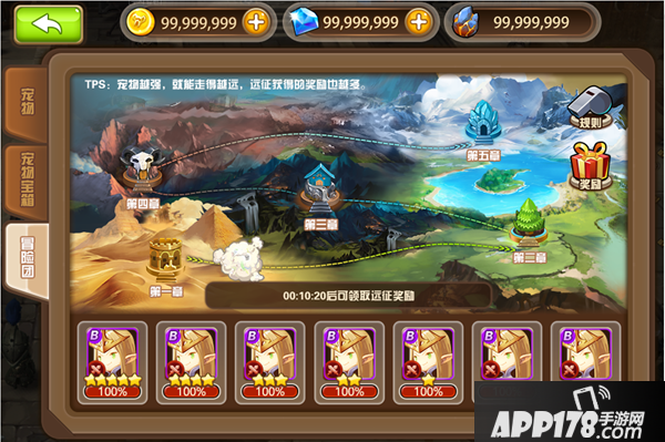 点击冒险团-指派宠物出征战斗,可以获得大量的资源。玩家可以选择7只宠物开启冒险团之旅,在一定之间后便可领取远征奖励。战斗力越高的宠物远征距离越远,与此同时,争战距离远离,得到的远征奖励也越丰厚哟。