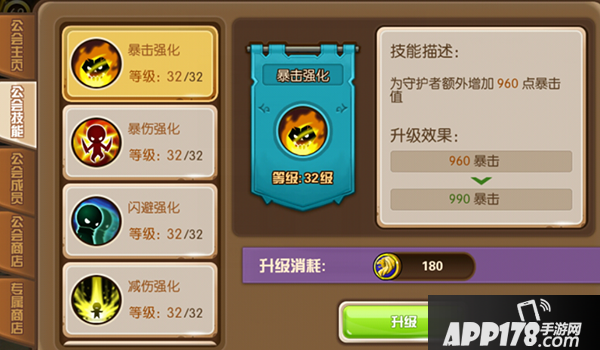 小编认为公会升级最大的好处就是公会技能了!因为它可以为各位守护者们增加额外的属性哦!并且这些属性是花钱也买不到的。综合下来可以为守护者们增加相当多的战斗力呦!当然是需要公会币来兑换的,那就需要各位守护者们多多为自己的公会做贡献了哦~共同打造你们的大家庭,获得的好处多多。还犹豫什么呢?赶快叫上你的小伙伴们,加入或创建一个公会,性价比不菲的战斗力唾手可得!
