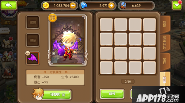 点击‘背包’-‘时装’,就能看到人物角色现在的时装装备,分为‘武器’ ‘套装’和‘翅膀’, 每个装备栏的里所装备的配饰都具有其特殊的时装属性。时装可以整理,低级时装还可以熔炼,绝对不浪费小伙伴手中的任何资源!点击‘理发店’,还可以给小守护者们改变发型哟!多种多样的发型绝对会让你眼前一亮!