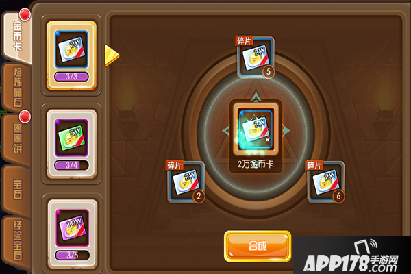 夺宝里分为五个模块,包括金币卡、熔炼晶石、宠物饼、宝石和经验宝石。是不是都是好东西呢?这里要稍微注意一下,好东西是不会让你一下子就拿走的,抢夺成功后只会得到相应的碎片,满足碎片数量要求后就可以合成这个物品了。每个模块里还区分开来了物品的高低等级,比如金币这里有三个等级,分为2W、5W和10W,2W的金币碎片只需要三个就可以合成了,再高一些的5W金币卡则需要4个金币碎片才能合成,而10W的金币卡则需要5个才能合成了。每个模块里的物品都是如此,也就是说越高级的物品,需要的碎片也就越多,你所需要挑战的次数也就随之增加。