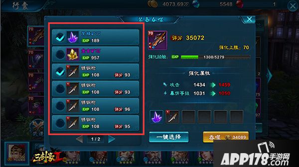 在左边区域确认想要消耗的材料,并打勾,然后点击“吞噬”按钮完成强化。当强化经验条满时,装备强化等级+1.