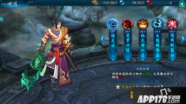 所有侠客防御力提升3.2%,主角暴击命中降低2%(心法效果随侠客星级提升)