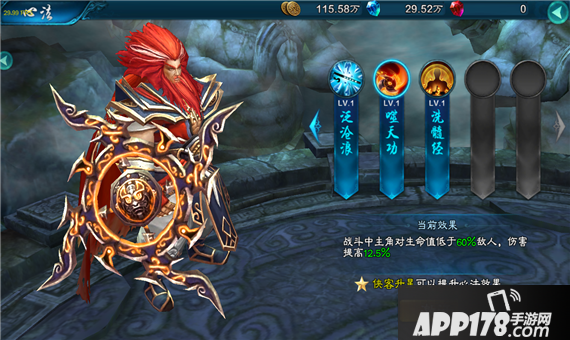 战斗中主角对生命值低于60%敌人,伤害提高15.5%(心法效果随侠客星级提升)