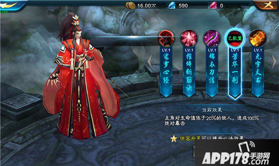 主角对生命值低于20%的敌人,造成100%绝对暴击(心法效果随侠客星级提升)