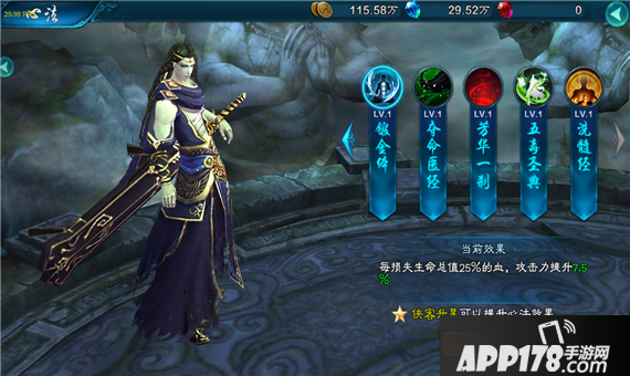 每损失生命总值25%的血,主角攻击力提升7.5%(心法效果随侠客星级提升)
