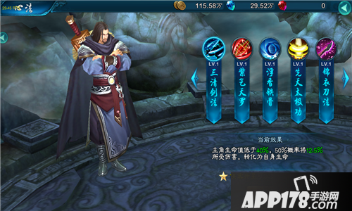 主角生命值低于40%,50%概率将12.5%所受伤害,转化为自身生命(心法效果随侠客星级提升)